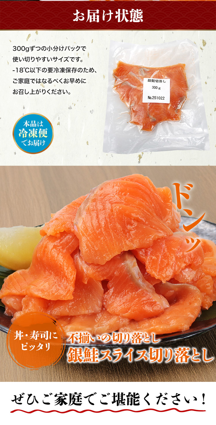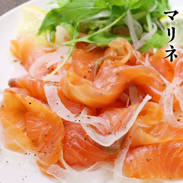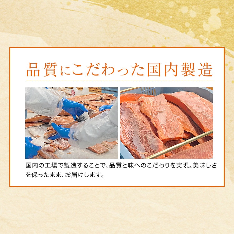 銀鮭(チリ産)、還元水あめ、食塩/調味料(有機酸等)、トレハロース、pH調整剤、酢酸Na、酸化防止剤(V.C、チャ抽出物)、グリシン、(一部にさけを含む)