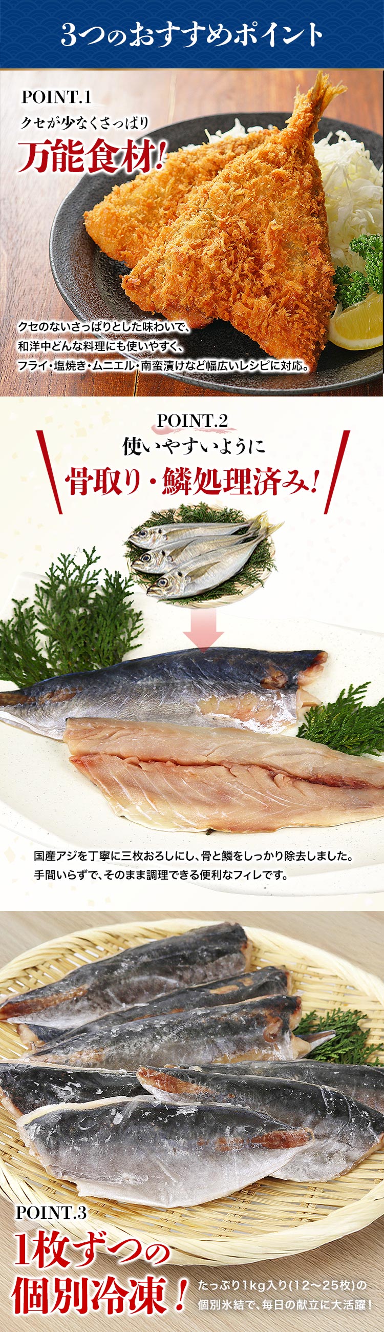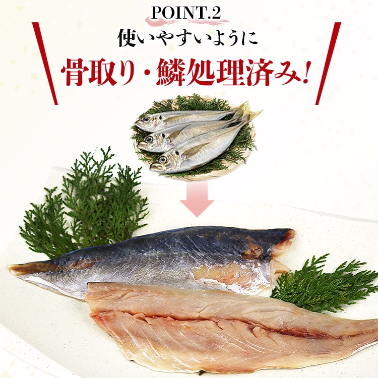 国産アジを丁寧に三枚おろしにし、骨と鱗をしっかり除去しました。