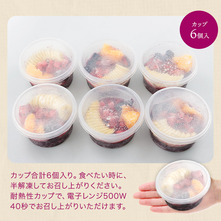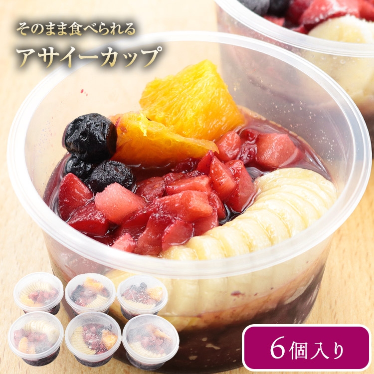 <商品詳細>【商品名】そのまま食べられる冷凍アサイーカップ【原材料】アサイーピューレ(ブラジル産)、バナナ、オレンジ、いちご、調整豆乳(大豆(カナダ産)砂糖、食塩)、マンゴー、ミックスベリー、ヨーグルト(乳製品、ゼラチン、寒天、乳酸菌(殺菌))、ブルーベリー、はちみつ【添加物】クエン酸、安定剤(ペクチン)、香料【アレルギー28品】バナナ、オレンジ、大豆、乳成分、ゼラチン【内容量】約150g×6【保存方法】要冷凍(ー18℃以下)【賞味期限】商品記載(※ご家庭用の冷凍庫の場合、1か月を目安にお早目にお召し上がり下さい。)