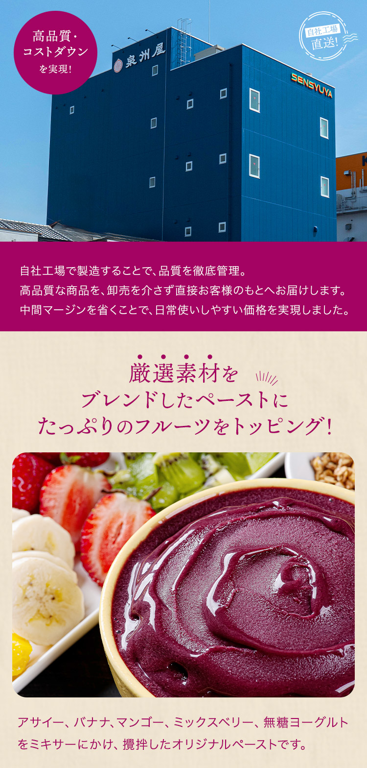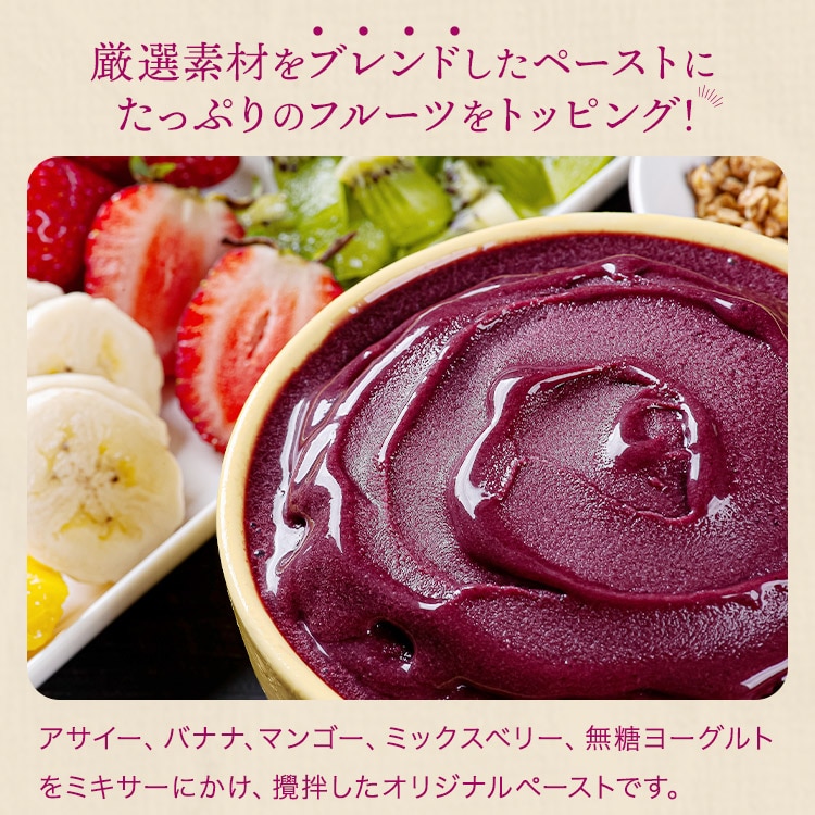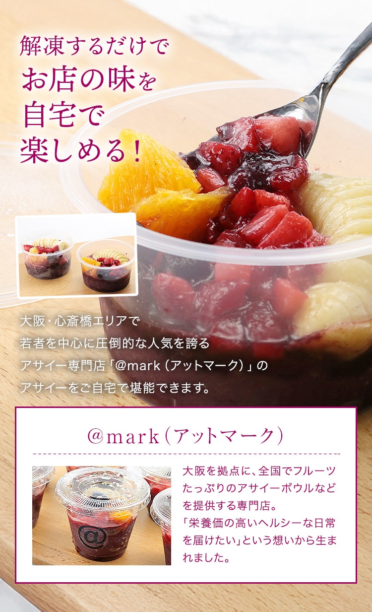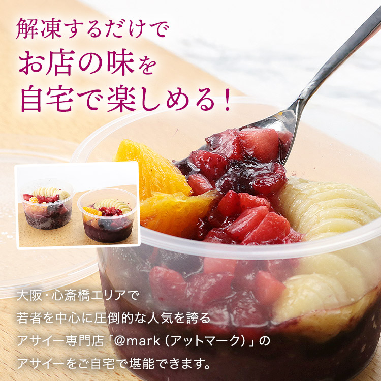 <商品説明>大阪・心斎橋エリアで若者を中心に圧倒的な人気を誇るアサイー専門店「@mark(アットマーク)」のアサイーをご自宅で堪能できます。アサイー、バナナ、マンゴー、ミックスベリー、無糖ヨーグルトをミキサーにかけ、攪拌したオリジナルペーストです。彩り豊かな4種のフルーツに、やさしい甘さのはちみつをプラス。見た目も味わいも華やかに!※バナナが変色する可能性がありますが、品質には問題ございません。※原産国は時期によって変更する場合がございます。