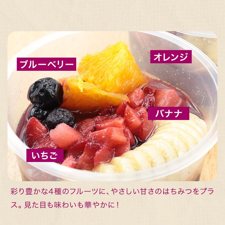 彩り豊かな4種のフルーツに、やさしい甘さのはちみつをプラス。