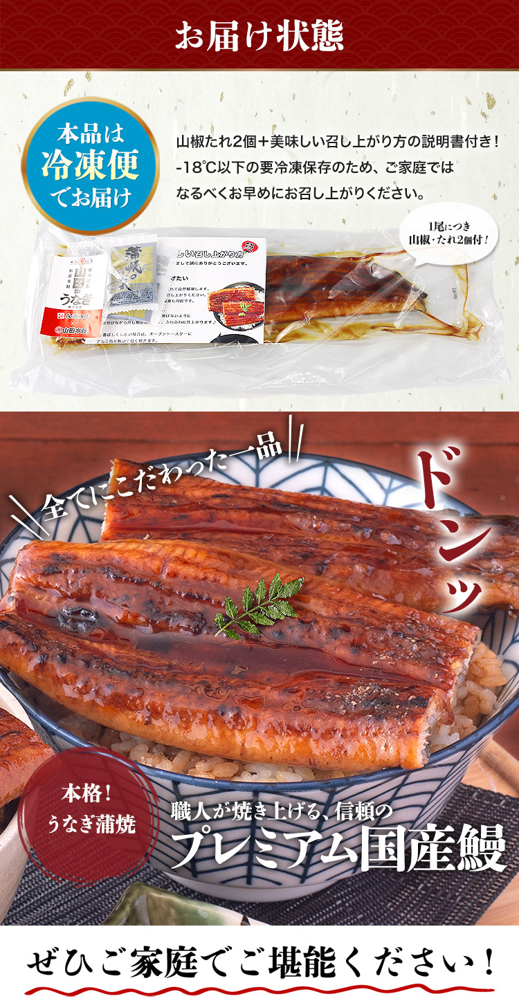 <商品詳細>【名称】うなぎ蒲焼【原材料名】うなぎ(鹿児島県)、しょうゆ(大豆・小麦を含む)、砂糖、みりん、水あめ、発酵調味料【添加物】増粘剤(加工でん粉、増粘多糖類)【内容量】1尾【保存方法】要冷凍-18℃以下【賞味期限】商品記載(※ご家庭用の冷凍庫の場合、1ヶ月を目安にお早目にお召し上がり下さい。)