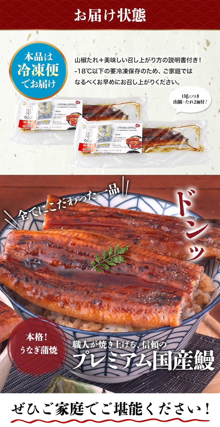 <商品詳細>【名称】うなぎ蒲焼【原材料名】うなぎ(鹿児島県)、しょうゆ(大豆・小麦を含む)、砂糖、みりん、水あめ、発酵調味料【添加物】増粘剤(加工でん粉、増粘多糖類)【内容量】2尾【保存方法】要冷凍-18℃以下【賞味期限】商品記載(※ご家庭用の冷凍庫の場合、1ヶ月を目安にお早目にお召し上がり下さい。)