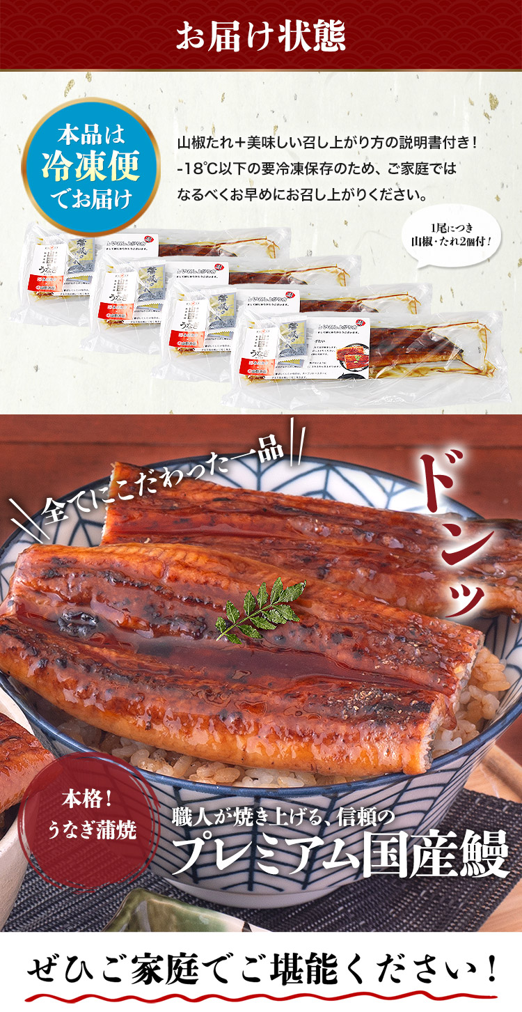 <商品詳細>【名称】うなぎ蒲焼【原材料名】うなぎ(鹿児島県)、しょうゆ(大豆・小麦を含む)、砂糖、みりん、水あめ、発酵調味料【添加物】増粘剤(加工でん粉、増粘多糖類)【内容量】4尾【保存方法】要冷凍-18℃以下【賞味期限】商品記載(※ご家庭用の冷凍庫の場合、1ヶ月を目安にお早目にお召し上がり下さい。)