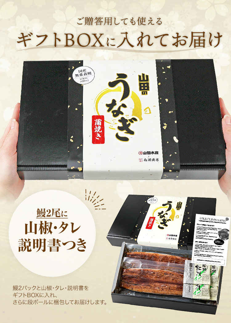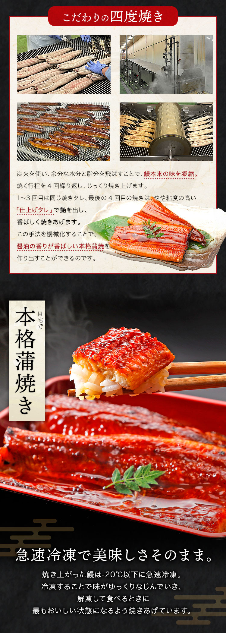 <商品詳細>【名称】うなぎ蒲焼【原材料名】うなぎ(鹿児島県)、しょうゆ(大豆・小麦を含む)、砂糖、みりん、水あめ、発酵調味料【添加物】増粘剤(加工でん粉、増粘多糖類)【内容量】2尾【保存方法】要冷凍-18℃以下【賞味期限】商品記載(※ご家庭用の冷凍庫の場合、1ヶ月を目安にお早目にお召し上がり下さい。)