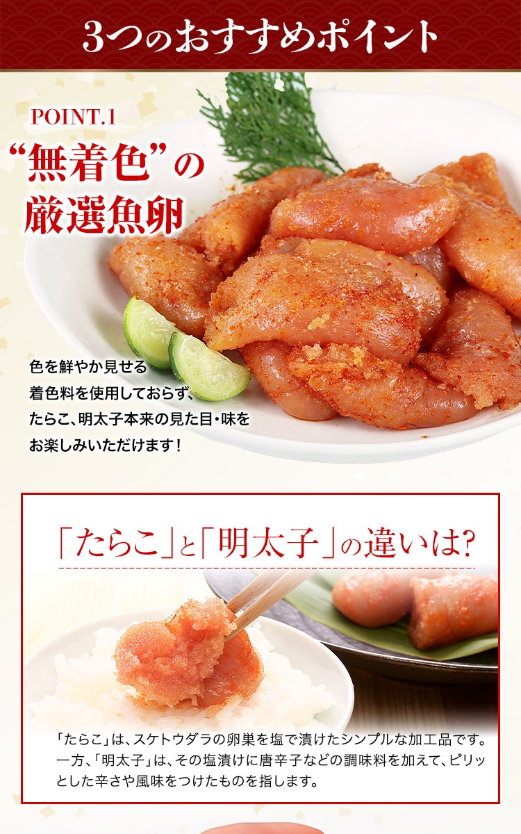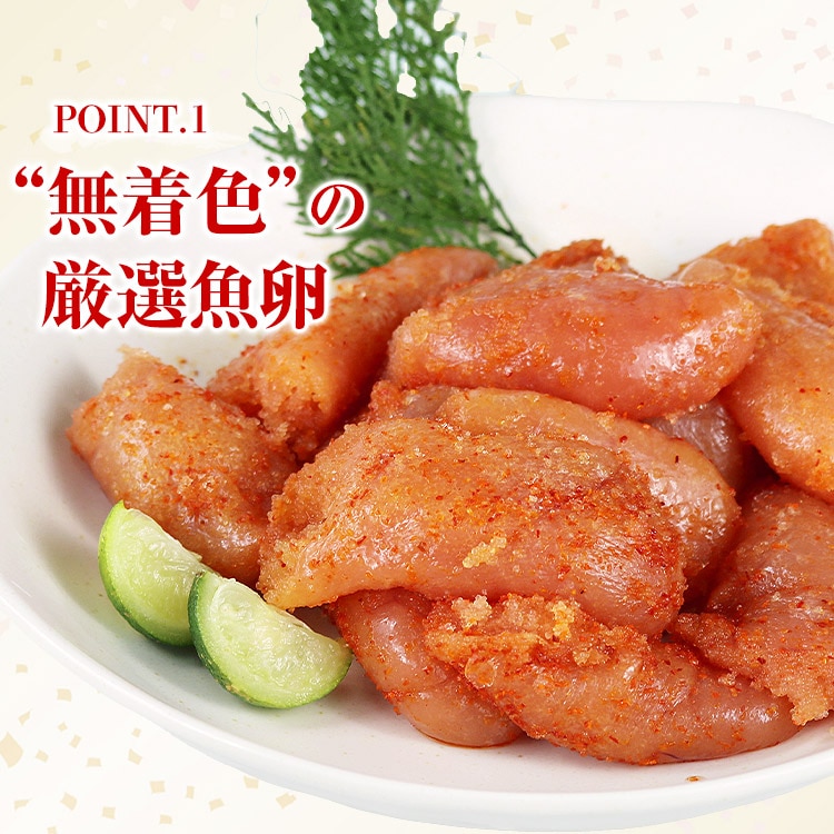 また、着色料を使用しておらず、明太子本来の見た目・味をお楽しみいただけます!