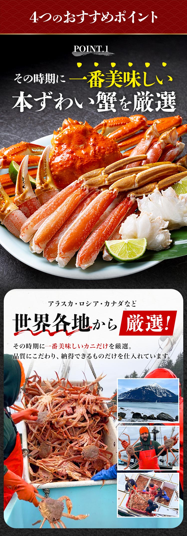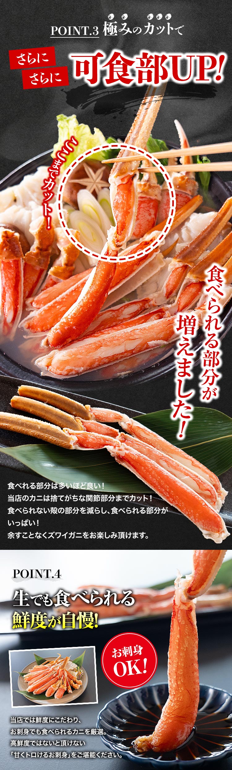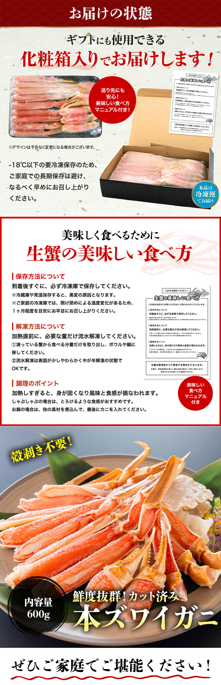 <商品説明>脚は『ビードロカット』という特殊加工 殻の下半分だけ残し旨みを残します!鍋や蟹しゃぶはもちろん焼蟹、天ぷらでも♪カット済みで内容量 600g!