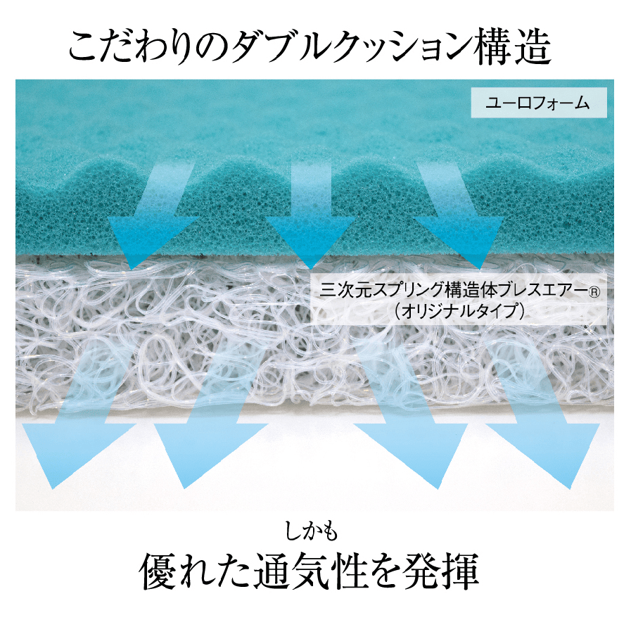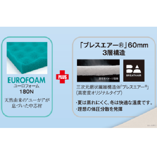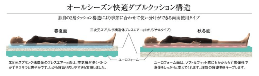 主に秋冬時期にユーロフォーム(凹凸)面、春夏時期にブレスエアーR(三次元スプリング構造体)面をご使用頂く事でオールシーズンご使用頂けます。