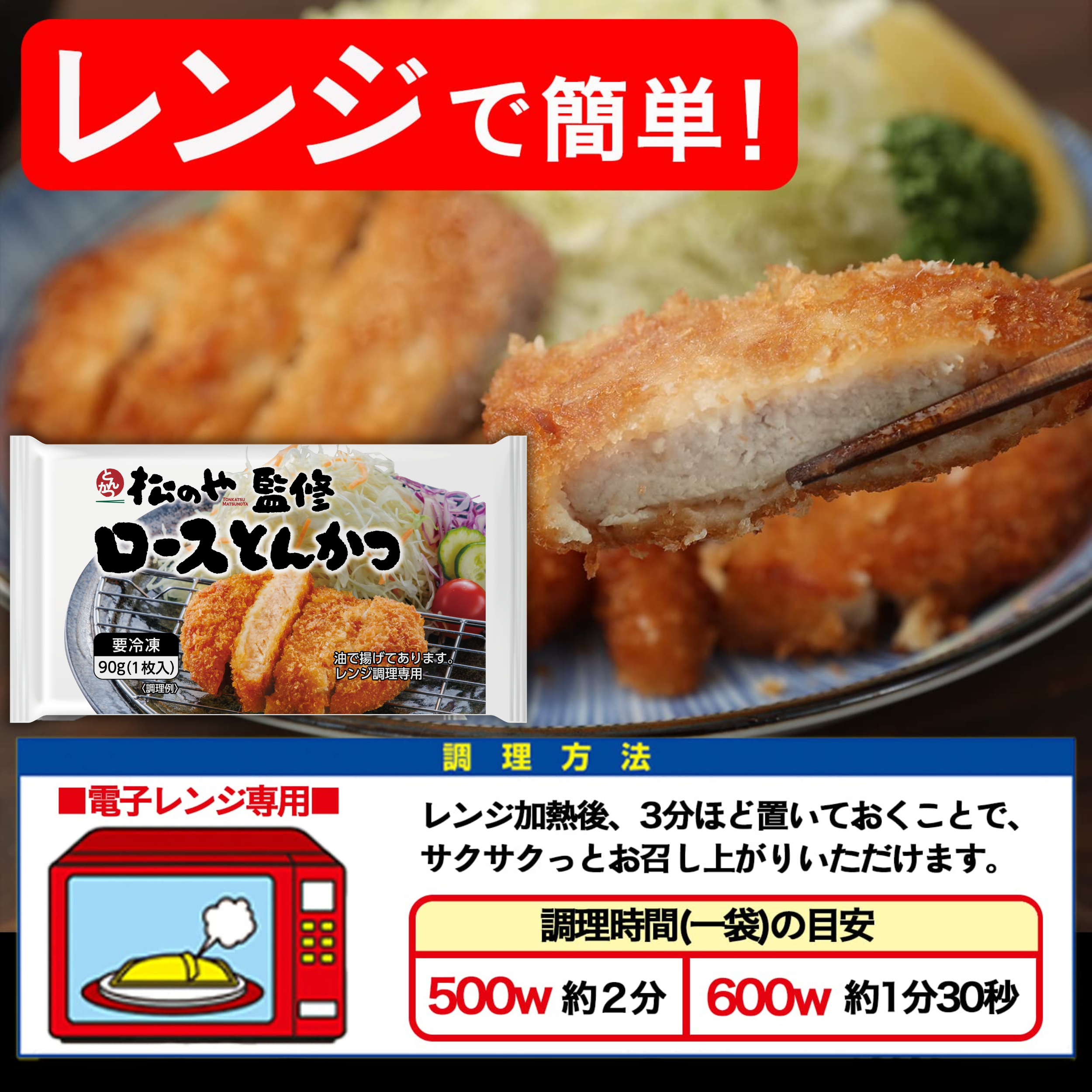 【調理方法】凍ったままの商品を取り出してトレーのままラップをかけずに電子レンジで加熱(500wで2分/600Wで1分30秒)してください。加熱後そのまま3分おくと、よりおいしくお召し上がりいただけます。