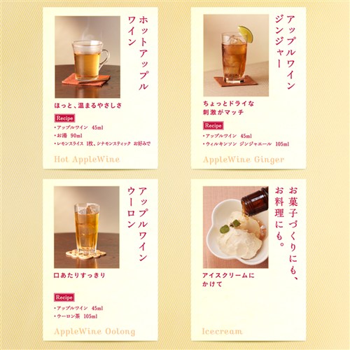 熟成されたリンゴの香り、まろやかな甘さ ■ニッカの歴史と共にあるワイン ニッカウヰスキー創業者 竹鶴政孝がニッカウヰスキーの前身「大日本果汁株式会社」を設立したのが1934年。 アップルワインは、その4年後の1938年に誕生しました。以来、ニッカのロングセラーとしてたくさんの方々に飲まれています。 ニッカ アップルワインは、まろやかな甘さで深い余韻のある味わいが特徴。 リンゴのワインにリンゴブランデーを加えたうえ、ブランデー樽にてゆっくりと熟成させた原酒を一部使用しています。 ニッカを漢字で書くと「日果」。ニッカウヰスキーの前身は「大日本果汁株式会社」。その社名は、ウイスキーが熟成し、販売できるようになるまでリンゴジュースなどをつくっていたことに由来します。「 ニッカ アップルワイン」も、実はニッカ最初のウイスキーより先に生まれました。 ストレート、ロック、水割り、ホット、ハイボールはもちろん、 紅茶やウーロン茶も相性ぴったり。デザートやお料理にも使えます。