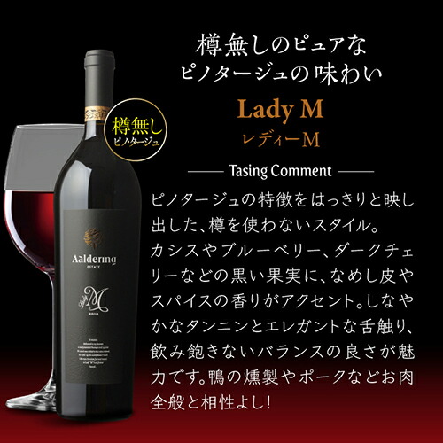 樽無しのピュアなピノタージュの味わい 樽不使用のピノタージュは黒い果実、例えばブラックカラント、ブルーベリーそしてダークチェリーの香りが鼻いっぱいに広がります。 骨格はエレガントで品があり、ピノタージュ特有の香りにアルダリンのテロワールの質の高さが伺えます。鴨の燻製やプルドポークまたはシンプルに前菜がおすすめです。