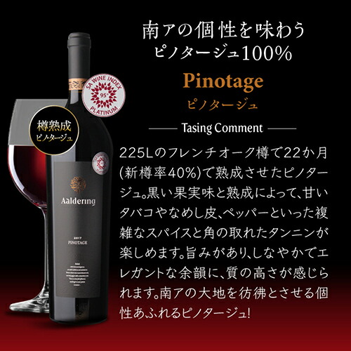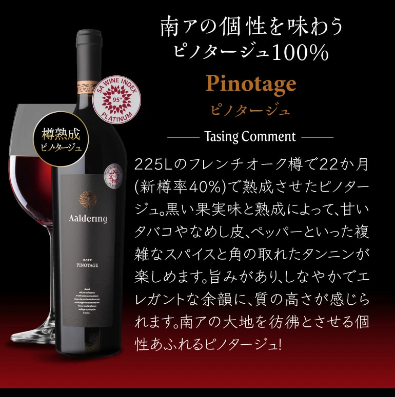 これぞ南アのピノタージュ!SAインデックス プラチナム賞 エレガントな果実感があり、ワインの持つ要素としなやかさが感じられる。 チェリーと甘いたばこの香りに、ラズベリーのニュアンスにレッドペッパーがアクセントとして香る。 風味豊かで旨味ある味わいを余韻に長く感じられる。 南アフリカワインインデックス 95+点 プラチナム賞(2017VT)。