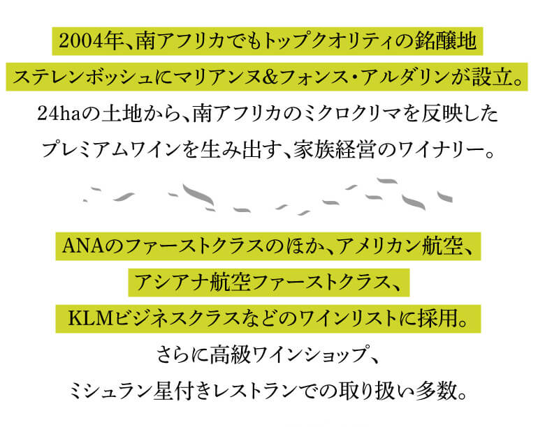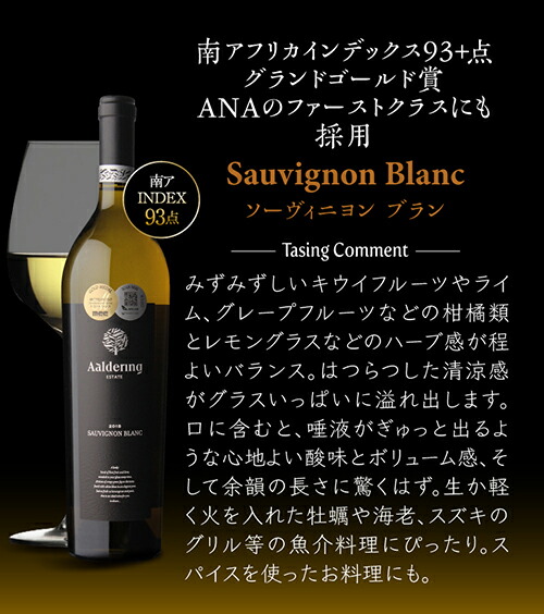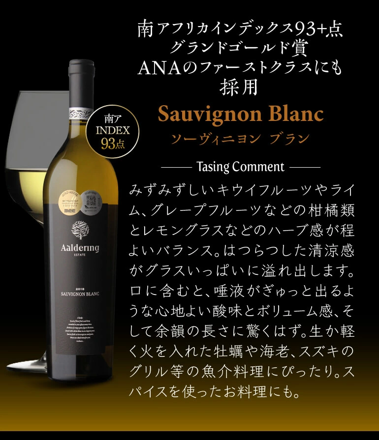 南アフリカインデックス 93+点 グランドゴールド賞 キウイフルーツやライムの組み合わさったハツラツ感がグラスに口をつけるたび衰えることなく感じられます。 若いイチジクの香りに白百合がエレガントに香り、さらにレモングラスや梨といった瑞々しさがあります。 生かもしくはスパイスで簡単に調理した牡蠣やエビ料理、スズキのグリル等の食事とピッタリです。
