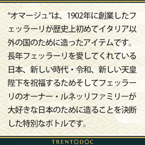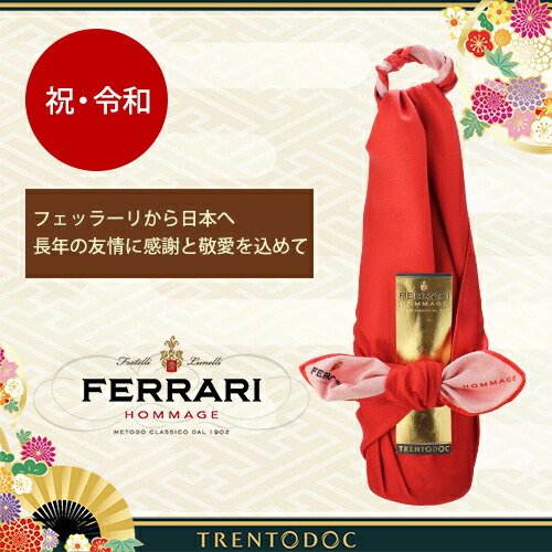 「令和」を祝し日本へ敬意を表して造られた日本限定のスペシャルキュヴェ!紅色の風呂敷に包まれた特別なフェラーリオマージュ 鮮やかな紅色の風呂敷に包まれたフェッラーリオマージュ。慶事の贈り物やお持たせとして優雅な空間を演出します。豊かな果実味と芳醇なアロマ。フルーツの風味と香ばしさがバランスよく、40ヶ月の熟成で多層的な味わいに仕上がっています。 フェッラーリ オマージュは、新しい「令和」の時代を迎える日本へ敬意を表して造られた日本限定のスペシャルキュヴェ。エチケットには和風の美しい模様があしらわれ、華やかに日本を祝福しています。