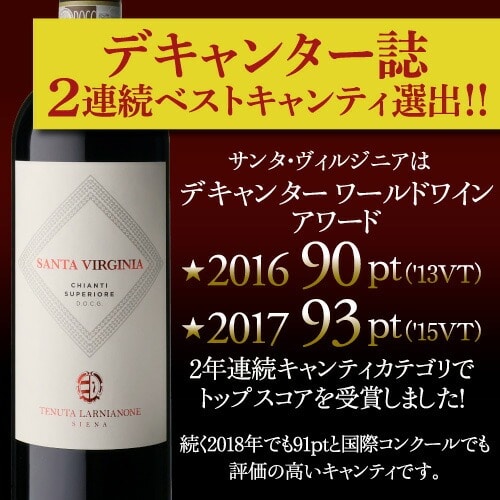 デキャンター誌2016,2017でキャンティカテゴリ最高位獲得! 香りは熟成したイチゴ、ユーカリ、サクランボ、ミントなどの複雑な香りに、口あたりは柔らかく奥行きが深く繊細な味わいです。 平均樹齢40年のブドウを使用している。 収穫は手作業で行い、発酵はセメントタンクで2週間行います。 その後、セメントタンクで4か月熟成し、ハンガリー産及びフランス産のトノーで8か月熟成し、瓶内熟成で6か月経ってから出荷。 受賞歴:Decanter2016 90pt(2013VT),Decanter2017 93pt(2015VT),ジャンシス・ロビンソン テイスティング 16.5点/20点(2017VT)