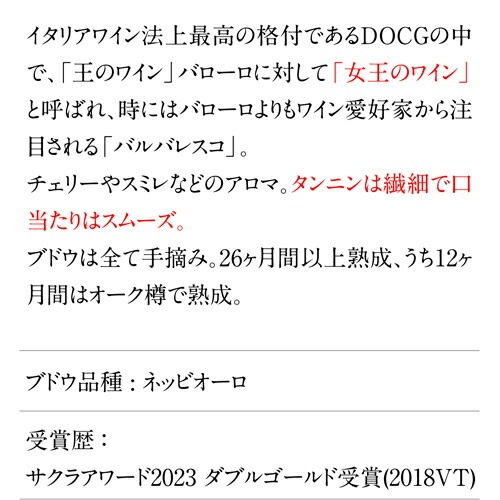 ![バルバレスコ [2020 or 2021] ローザ デル オルモ 750ml 6本入 イタリア ピエモンテ ネッビオーロ DOCG 赤ワイン ケース 長S【送料無料】](/contents/0064/img/goods/L/0064-429204-6.jpg)