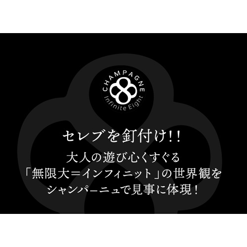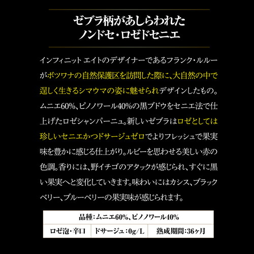 ★適正温度でエンブレムがピンクに★ シャンパーニュ インフィニット エイトの社長であるフランク・ルルー氏がボツワナの自然保護区を訪問した際に、大自然の中で逞しく生きるシマウマの姿に魅せられデザインされました。 ムニエ60%、ピノノワール40%の黒ブドウをセニエ法で仕上げたロゼシャンパーニュ。 新しいゼブラはロゼとしては珍しいセニエかつドサージュゼロでよりフレッシュで果実味を豊かに感じる仕上がり。 ルビーを思わせる美しい赤の色調。香りには、野イチゴのアタックが感じられ、すぐに黒い果実へと変化していきます。 味わいにはカシス、ブラックベリー、ブルーベリーの果実味が感じられます。