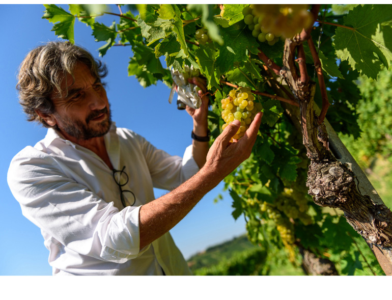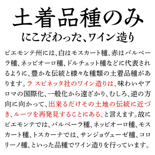 ピエモンテ州には、白はモスカート種、赤はバルベーラ種、ネッビオーロ種、ドルチェット種などに代表されるように、豊かな伝統と様々な種類の土着品種があります。ラ スピネッタ社のワイン造りは、味わいやアロマの国際化、一般化から遠ざかり、むしろ、逆の方向に向かって、出来るだけその土地の伝統に近づき、ルーツを再発見することにある、と言えます。故にピエモンテでは、バルベーラ種、ネッビオーロ種、モスカート種、トスカーナでは、サンジョヴェーゼ種、コロリーノ種、といった品種でワイン造りを行っています。