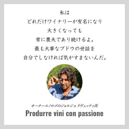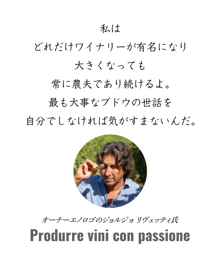 そのため、ラスピネッタ社が造るワインには「ジョルジョリヴェッティ」ではなく、「ガッリーナ」「スタルデリ」「ヴァレイラーノ」「セッツァーナ」「サッソンティーノ」というように、ブドウが造られる畑の名前が付けられているのです。カンティーナでの作業もこの哲学に従っています。 また、先進技術を取り入れたり、オークの新樽を活用することによって、ワイン造りにおいて重要な要素のひとつである衛生面へも細心の注意を払っています。