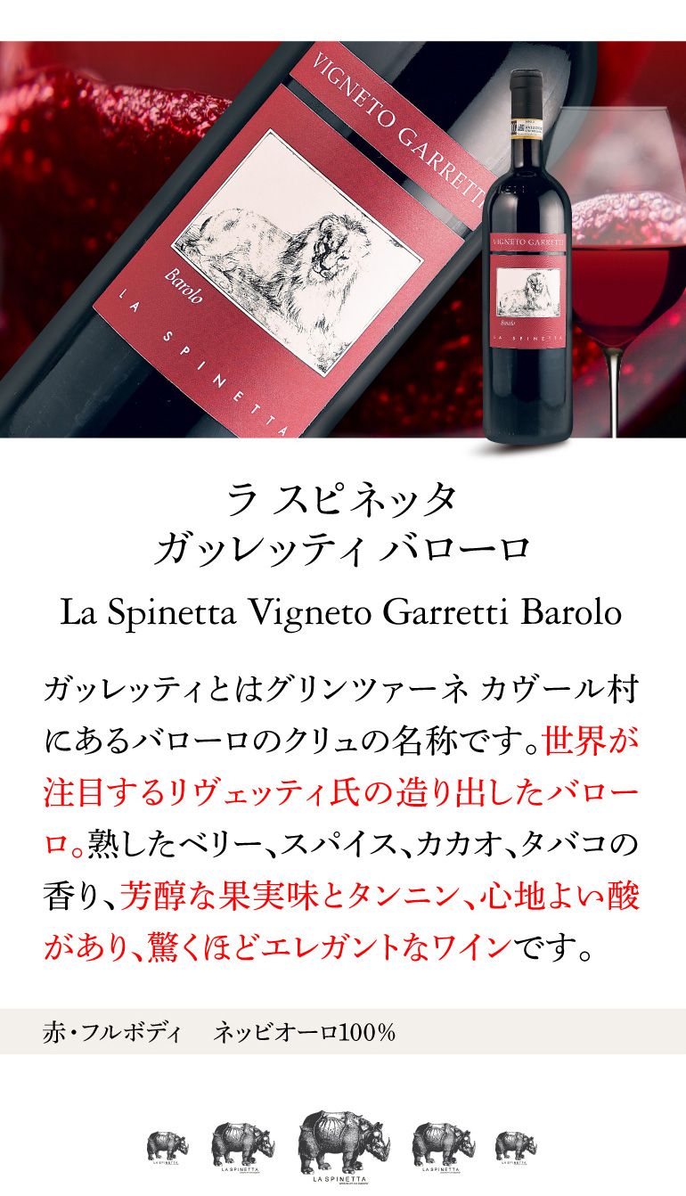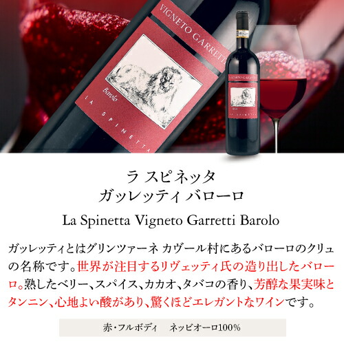 芳醇な果実味と上品なタンニン、心地よい酸が印象的 “ガッレッティ”はグリンツァーネ・カヴール村にあるバローロのクリュの名称です。オレンジのドライフルーツ、クローブやベリーのような赤い果実の熟した香り。味わいは、フレッシュさとしっかりとした骨格のバランスがよく、ミントやスパイスを感じる。輪郭のはっきりしたタンニンが湧き上がります。 世界が注目するリヴェッティ氏の造り出したバローロ。2000年のファーストヴィンテージから評価は非常に高く、ラ・スピネッタ社の新たな伝統を生む逸品となりました。熟したベリー、スパイス、カカオ、タバコの香り、芳醇な果実味と上品なタンニン、心地よい酸が印象的なワインです。