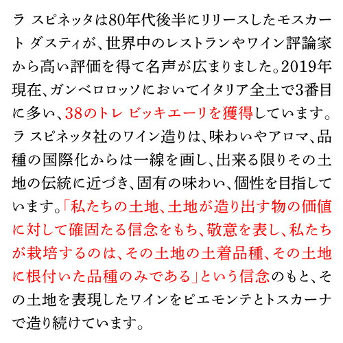 ラ スピネッタは80年代後半にリリースしたモスカートダスティが、世界中のレストランやワイン評論家から高い評価を得て名声が広まりました。2019年現在、ガンベロロッソにおいてイタリア全土で3番目に多い、38のトレビッキエーリを獲得しています。ラスピネッタ社のワイン造りは、味わいやアロマ、品種の国際化からは一線を画し、出来る限りその土地の伝統に近づき、固有の味わい、個性を目指しています。「私たちの土地、土地が造り出す物の価値に対して確固たる信念をもち、敬意を表し、私たちが栽培するのは、その土地の土着品種、その土地に根付いた品種のみである」という信念のもと、その土地を表現したワインをピエモンテとトスカーナで造り続けています。