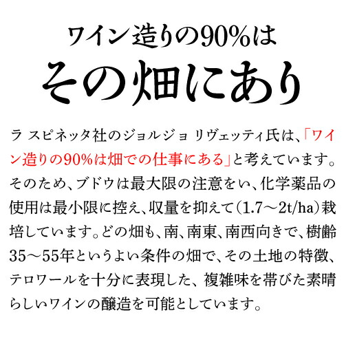 ラ スピネッタ社のジョルジョリヴェッティ氏は、「ワイン造りの90%は畑での仕事にある」と考えています。そのため、ブドウは最大限の注意をい、化学薬品の使用は最小限に控え、収量を抑えて(1.7~2t/ha)栽培しています。どの畑も、南、南東、南西向きで、樹齢35~55年というよい条件の畑で、その土地の特徴、テロワールを十分に表現した、 複雑味を帯びた素晴らしいワインの醸造を可能としています。