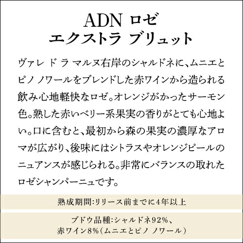 軽やかで食事が進むロゼシャンパン オレンジがかったサーモン色。熟した赤いベリー系果実の香りがとても心地よい。口に含むと、最初から森の果実の濃厚なアロマが広がり、後味にはシトラスやオレンジピールのニュアンスが感じられる。非常にバランスの取れたロゼシャンパーニュです。 ▼醸造・熟成 自生酵母を使用し、72hlの大型のオーク樽でアルコール発酵、マロラクティック発酵は行いません。ボトリング時はわずかにろ過を行います。 熟成はオーク樽(カスク)で平均12か月を過ごしたのち、瓶内熟成は5年行います。