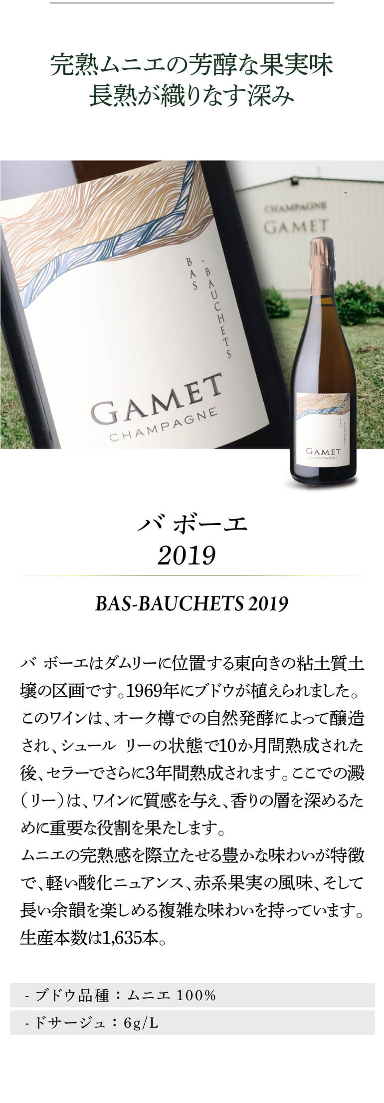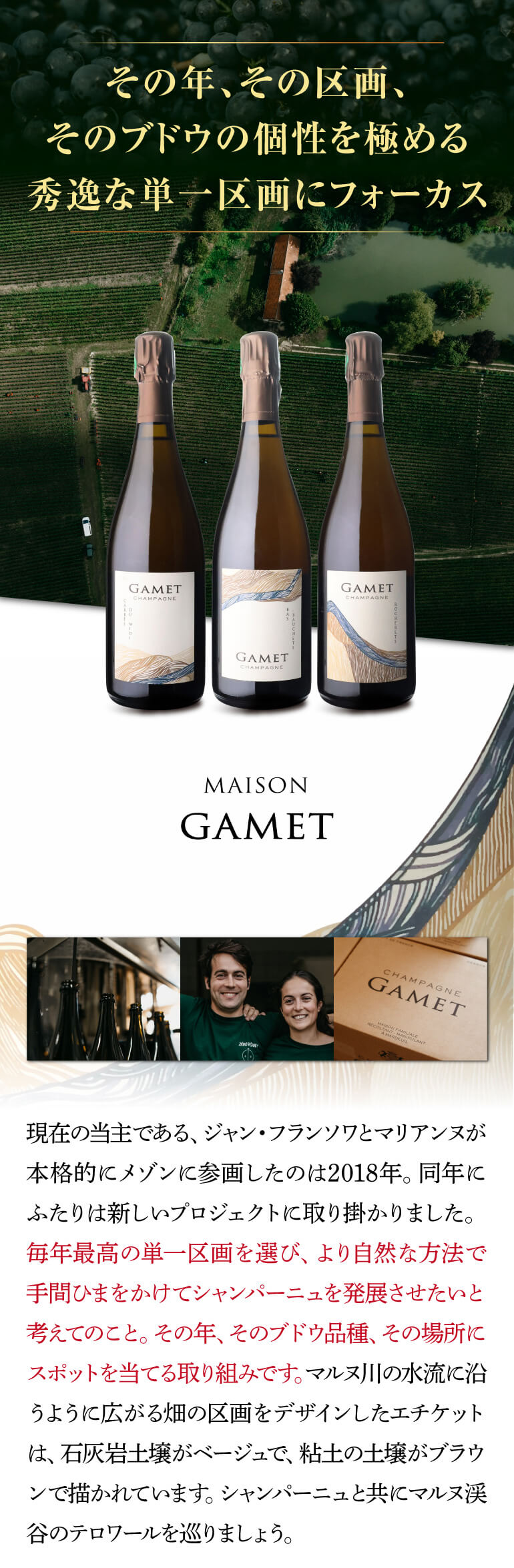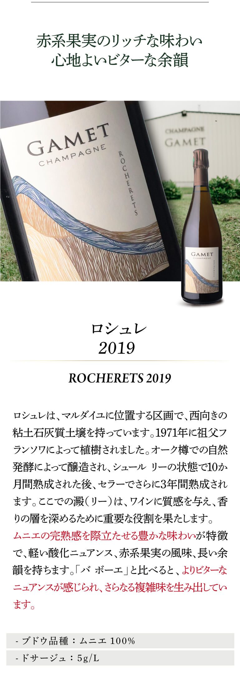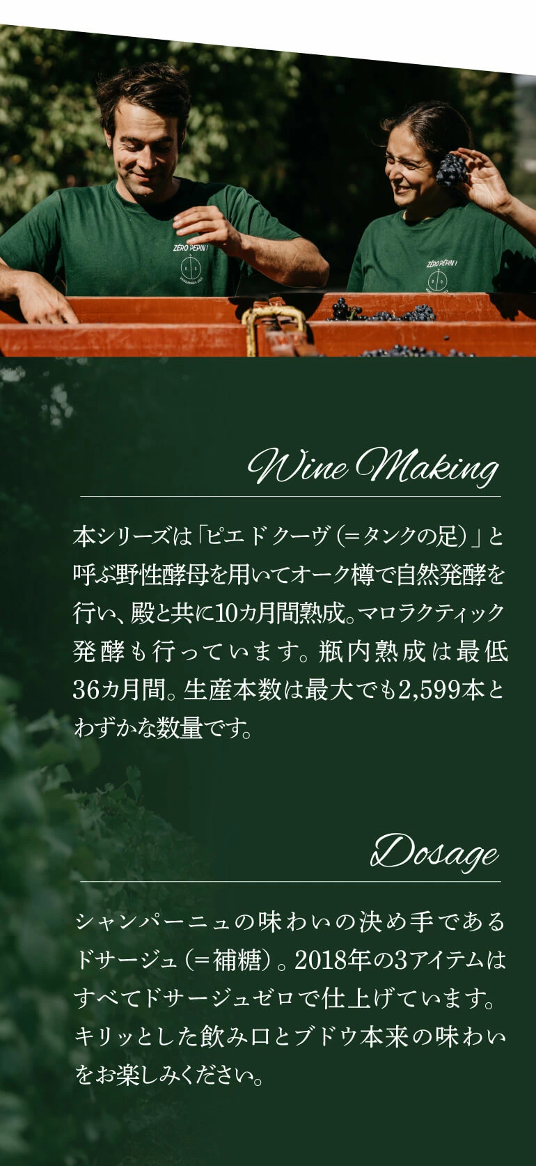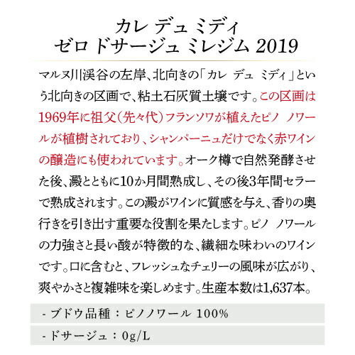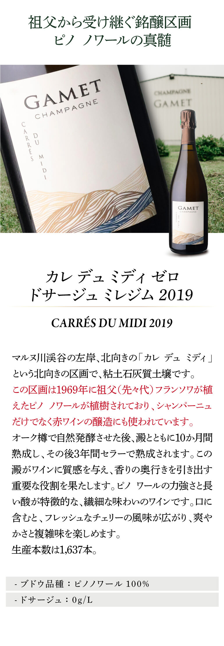 単一区画のピノ100%ノンドサージュ極辛口シャンパーニュ 単一区画「カレ・デュ・ミディ」のピノ・ノワールから造られたブラン・ド・ノワールのシャンパーニュ。 この区画はマルダイユ村の北向き斜面に位置し、粘土石灰岩の土壌です。1969年に祖父フランソワによって植えられました。 オーク樽で発酵・醸造を行い、10か月間の樽熟成を経てから、3年間の瓶内熟成を行います。 樽熟成によりテクスチャとアロマに奥行きが加わり、ピノ・ノワールの力強さと長い酸が特徴の繊細な味わいを持っています。 口当たりはチェリーの風味が感じられ、フレッシュさと複雑味が調和しています。
