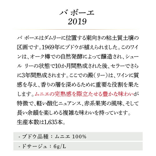 単一区画「バ・ボーエ」のムニエから造られたブラン・ド・ノワールのシャンパーニュ。 この区画はダムリー村右岸の東向き斜面に位置し、粘土質土壌が特徴です。1969年に植樹されたムニエから造られ、オーク樽で発酵・醸造を行い、10か月間の樽熟成を経てから、3年間の瓶内熟成を行います。 樽熟成によりテクスチャとアロマに奥行きが加わり、この区画特有のムニエの複雑さと豊かさがさらに引き立っています。わずかに酸化を感じさせるニュアンスと赤い果実の風味が調和し、長く続く余韻が魅力的です。