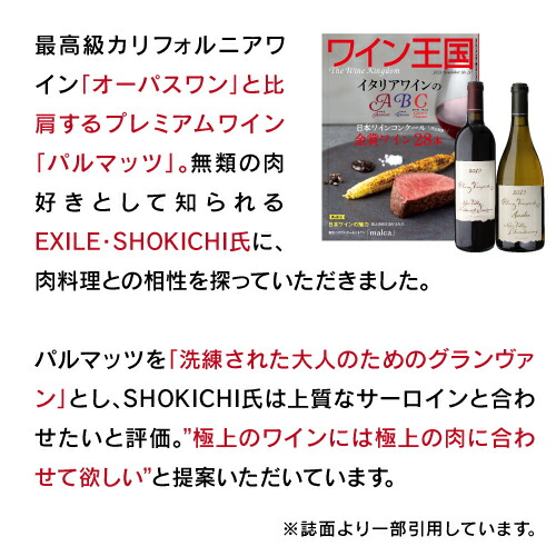 ポスト・オーパスと呼び声高いパルマッツの造る白! タンジェリンと桃の香りが漂い、口元に近づけると、爽やかな酸味のレモンカードが鮮やかに広がります。その後、繊細な白檀の香りやほのかな香木のニュアンスが見事に調和します。フルボディでありながらすっきりとした後味が特徴のこのワインは、豊かな質感を持ち、さまざまな料理との相性も抜群です。 100%樽発酵。70%フレンチークの新樽で、シュールリーで7ヶ月熟成。
