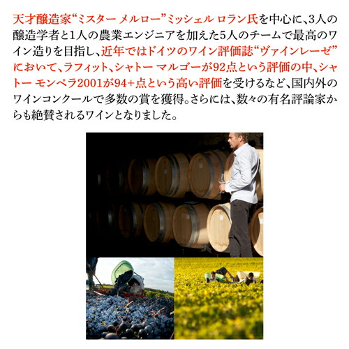モンペラ10年以上熟成ヴィンテージ! デリケートな赤い果実のピュアなノーズとスモーキーなタッチ。シルキーで豊満。バランスが良く調和が取れています。テロワールの複雑さが表現された1本。
