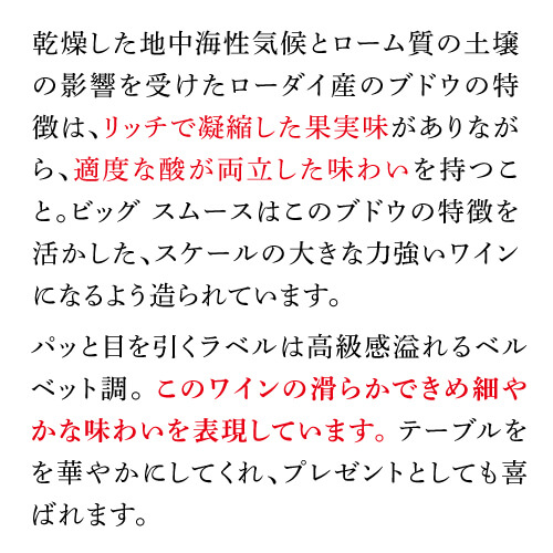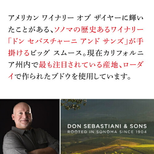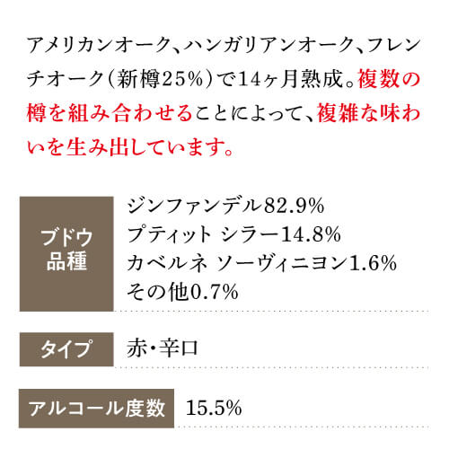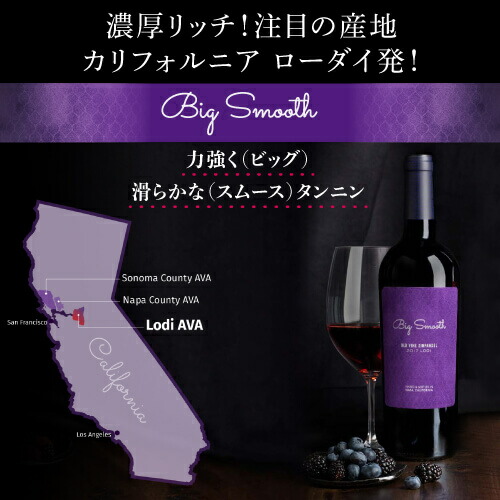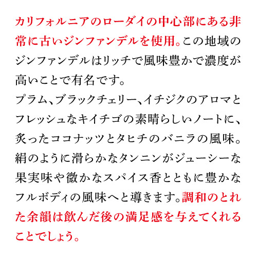銘醸ローダイ発!濃厚リッチなジンファンデル カリフォルニアのローダイ中心部にある非常に古いジンファンデルの木から収穫したブドウを使用。リッチで風味豊かで濃度が高いことで知られています。 ボイセンベリーとザクロのジューシーな果実味が、削りたてのココナッツとほのかなブラウン・スパイスの香りと混ざり合います。口に含むと豊かな果実味とそれを縁取るトーストしたココナッツとタヒチ産バニラ。絹のように滑らかなタンニンが口中に広がります。
