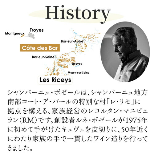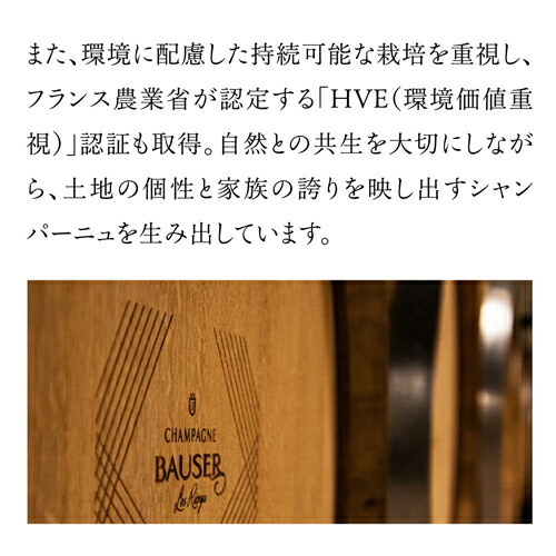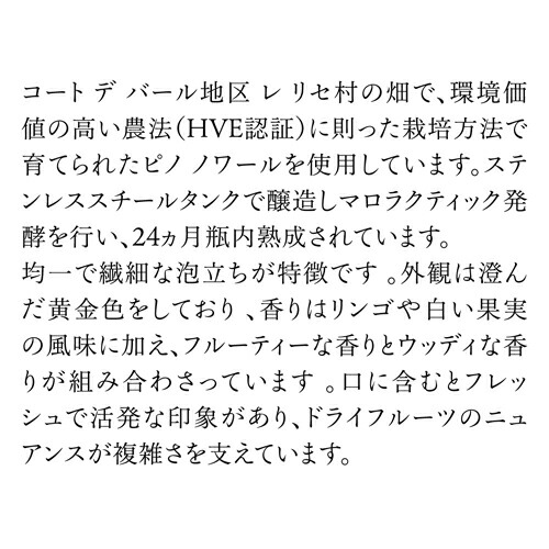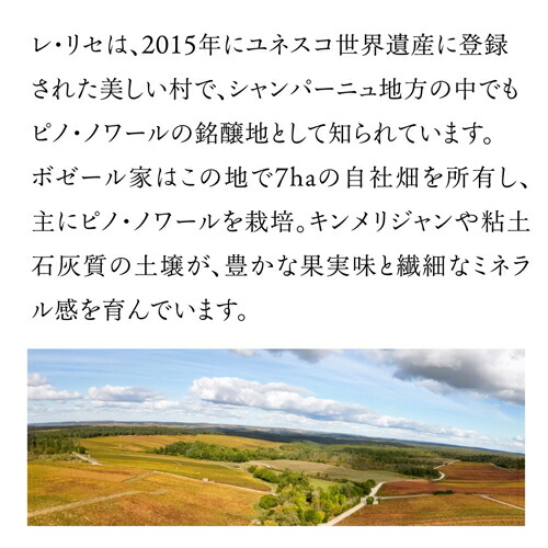 ボゼールの伝統が詰まった妥協なき品質 1975年創業家族経営のシャンパーニュメゾン「ボゼール」コート デ バール、レ リセ村の畑で、環境価値の高い農法(HVE認証)に則った栽培方法で育てられたピノ ノワールを使用しています。ステンレススチールタンクで醸造しマロラクティック発酵を行い、24ヵ月瓶内熟成されています。均一で繊細な泡立ちが特徴です 。外観は澄んだ黄金色をしており 、香りはリンゴや白い果実の風味に加え、フルーティーな香りとウッディな香りが組み合わさっています 。口に含むとフレッシュで活発な印象があり、ドライフルーツのニュアンスが複雑さを支えています。 ◆受賞歴◆ デキャンター 2024 シルバー受賞