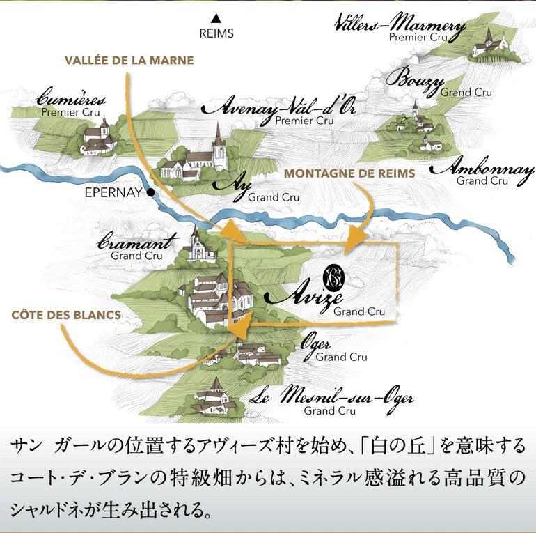 2023年1月号 ワイナート111号掲載 「多様性」「安定した品質」「複雑性」、これらをシャンパーニュで表現するサン ガール。 良年のみに造られるトップ キュヴェ『キュヴェ オルパール」は、シャンパンの帝王クリュッグの『クロ デュ メニル』にも匹敵すると称され、ワイン評論家ジェームス サックリンからも「見逃してはならない!」と評価を受けているほど。 深い黄金色。香りは柑橘類と砂糖漬けのレモンのニュアンス。ローストしたアーモンドとクルミ、スモーキーな(軽いタバコのような)ニュアンスが感じられ、すぐにバターと温かいパンの温かみのあるニュアンスへと移り変わります。驚くほど長い余韻が爽やかで、フィニッシュには見事なミネラルの質感が広がります。
