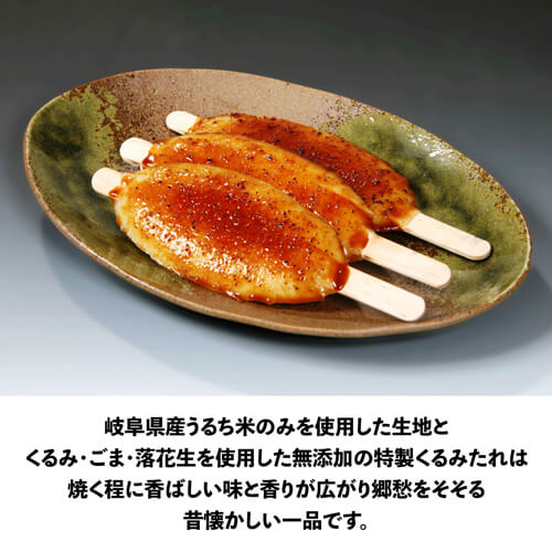 岐阜県産うるち米のみを使用した生地と、くるみ・ごま・落花生を使用した無添加の特製くるみたれは焼く程に香ばしい味と香りが広がり郷愁をそそる昔懐かしい一品です。ご家庭で郷土の味を召し上がれ!