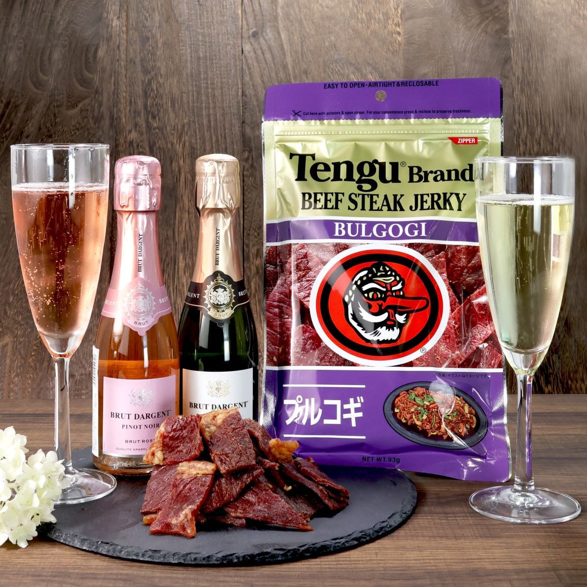 その日の気分で選べる白とロゼのスパークリングワインに、濃厚な旨味のプルコギジャーキーを添えて ■ブリュット ダルジャン ブランドブラン ミニ 200ml フランスを代表するシャルドネ種を100%使用し、高級シャンパーニュと同じ瓶内二次発酵をしています。 きめ細かな泡とクリーンで爽やかな辛口の飲み口です。 ■ブリュット・ダルジャン・ロゼ ミニ 200ml 高級品種ピノ ノワールを100%使用。黒ブドウ由来のどっしりとしたボディと上品な酸味、香ばしさのバランスが抜群です。華やかさの中に深みのある味わいです。 ■テング ビーフジャーキー プルコギ味 100%赤身ももステーキ肉をテング秘伝の醤油ダレをベースに、プルコギ風に味付けをしたビーフステーキジャーキーです。 噛むほどに牛肉の旨味とプルコギ特有の甘辛い味わいが口の中いっぱいに広がります。