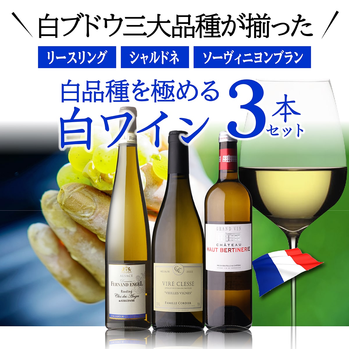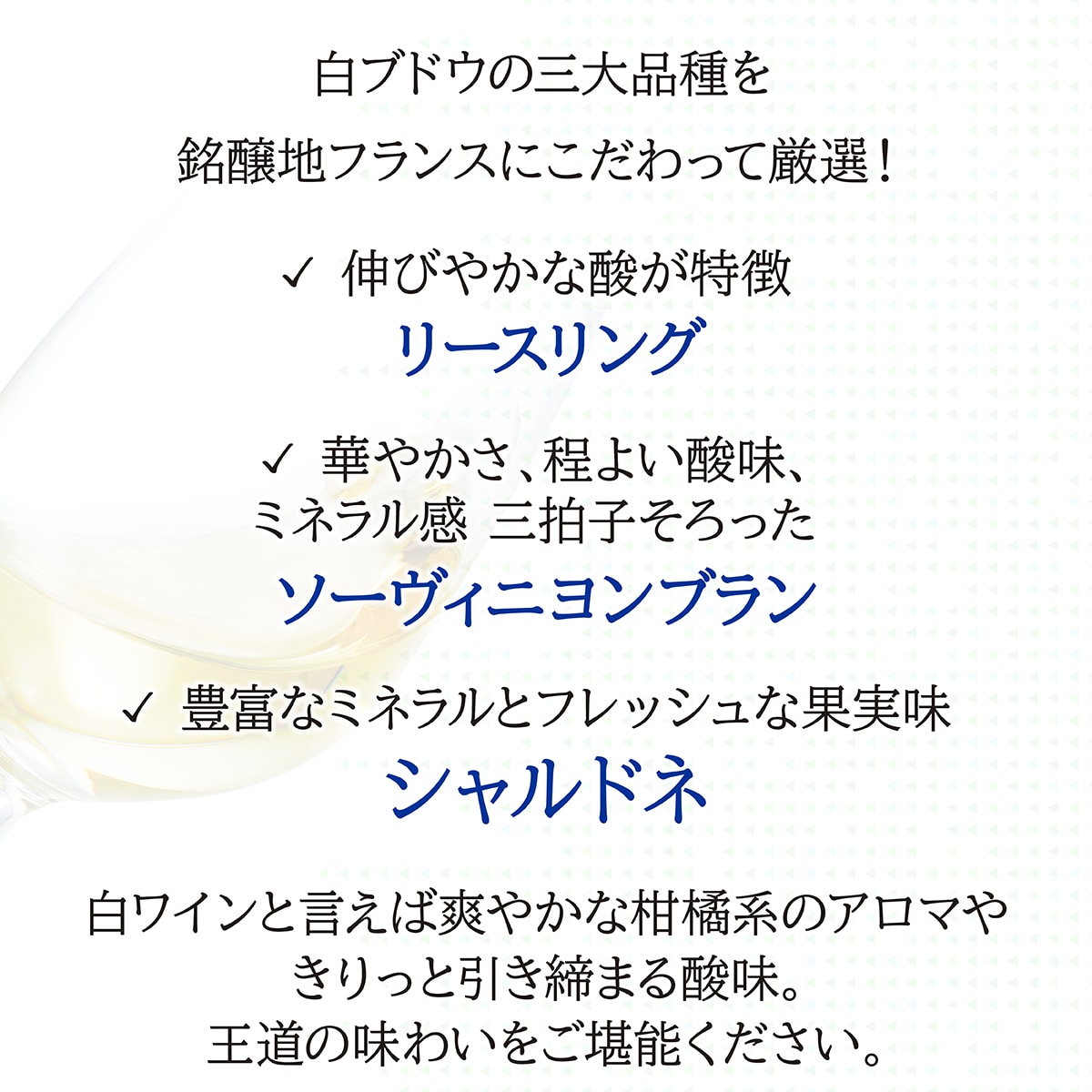 白ブドウの三大品種を銘醸地フランスにこだわって厳選!白ワインと言えば柑橘系のアロマや酸味。白ブドウ三大品種をご堪能ください。