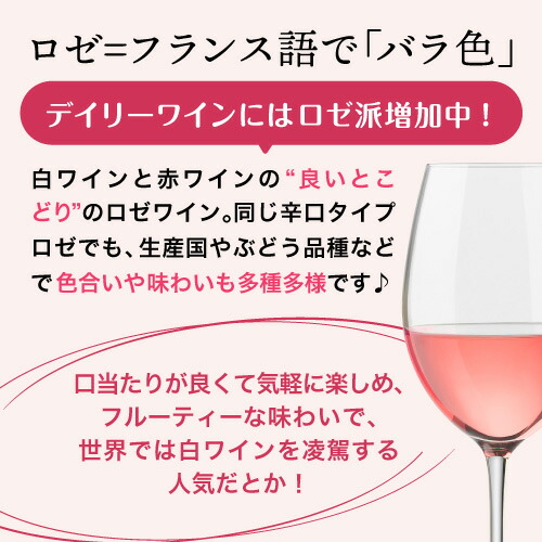同じ辛口タイプロゼでも生産国やブドウ品種などで色合いや味わいも多種多様です。華やかな見た目も食卓に彩りを添えること間違いなし!