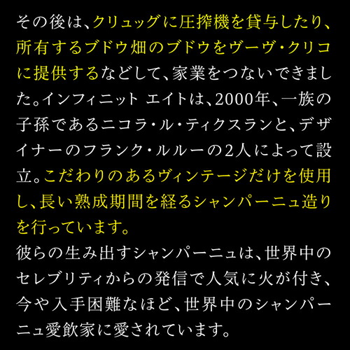 - > 【50%OFF 12/7まで】シャンパンセット グランクリュ入! インフィニット エイト クラシック 3本セット 750ml 3本入 浜運A【送料無料】