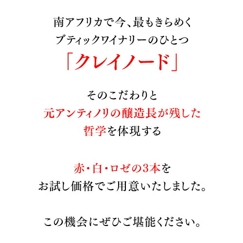 南アフリカで今、最もきらめくブティックワイナリーのひとつ「クレイノード」 そのこだわりと元アンティノリの醸造長が残した哲学を体現する赤、白、ロゼの3本をお試し価格でご用意しました。この機会にぜひご堪能ください。