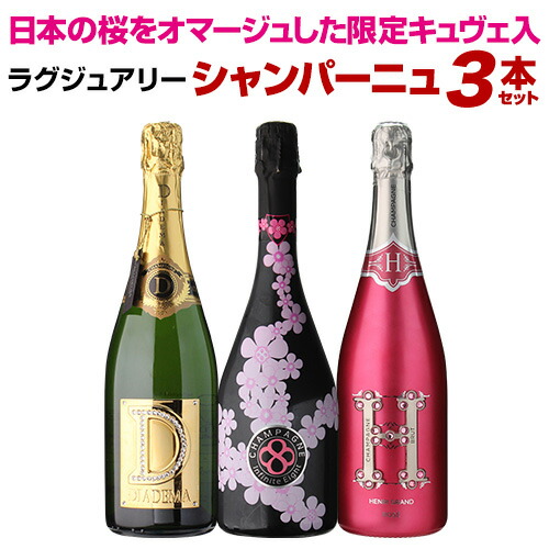 日本へのオマージュを桜に込めたリミテッドシャンパーニュと 一目見たら忘れない、Hのロゴが煌めくシャンパーニュと スワロフスキーのクリスタルを贅沢に45個も埋め込んだ豪華キュヴェ、永遠の女神の名を冠した黄金に輝く神々しい銘品の3本が入った豪華セット!数量限定で大特価!