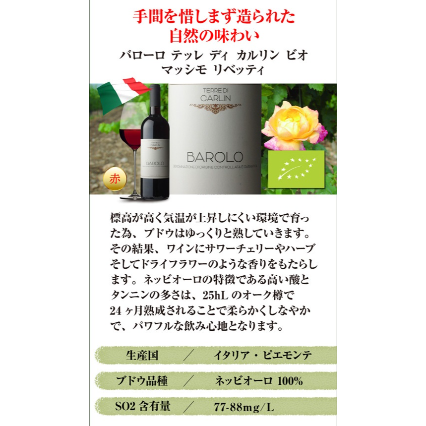 本品について、過去ヴィンテージ分についてはBIO認証及びユーロリーフ取得していましたが、2021ヴィンテージ分については生育上の理由により、有機ではあるものの認証機関認定外の製品(殺虫剤等)を使用せざるを得ない状況だったため、BIO認証は未取得となりました。その旨ご留意ください。