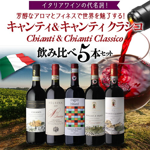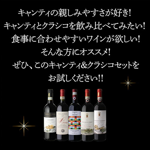 キャンティ & クラシコ 飲み比べ セット5本入り。本当に美味しいものだけを厳選しました! キャンティの親しみやすさが好き! キャンティとクラシコを飲み比べてみたい! 食事に合わせやすいワインが欲しい! そんな方にオススメのセットです♪