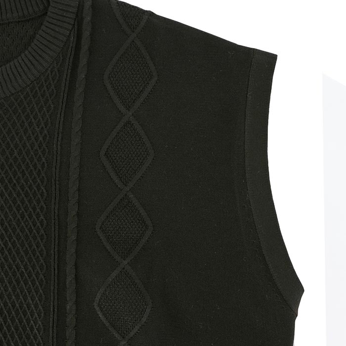 特長 綿のような肌触りが特徴のポリエステル糸を使用した、軽量で動きやすいニットベスト。クラシックなケーブル柄にスポーティーなラインを加え、やや大きめシルエットに仕上げました。トレンド感とベーシックさを兼ね備えたアイテムです。※ベスト以外は商品に含まれません。