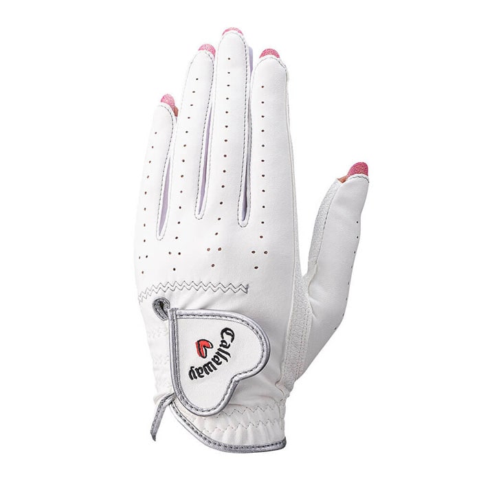 両手用。 ロングネイルのゴルファー向けに、指先をカットしたモデル。 掌側には、グリップ力を高めるHex in Hex パターンを施した生地を使用。 タブのLOVE Callaway のロゴがスタイリングのアクセントに。