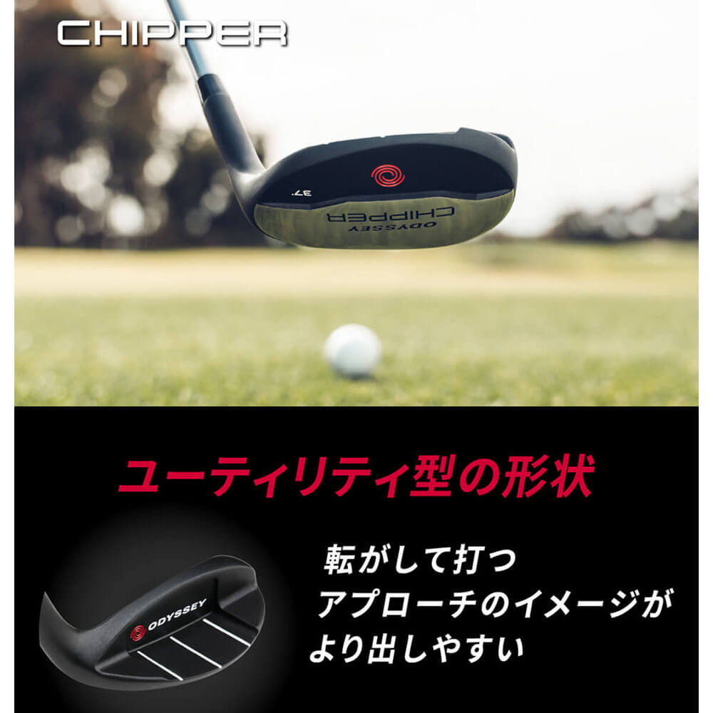 メンズは長さ34.5インチで、ウィメンズは33.5インチ 「ODYSSEY CHIPPER」のクラブ長さは34.5インチとなっており、同時に女性ゴルファー向けの33.5インチ仕様となっている「ODYSSEY CHIPPER ウィメンズ」もラインアップしています。 ロフトはいずれも37度の設定です。フェース面には、ソフトフィーリングのポリマーインサートを装着。距離感を揃えやすい、心地良い打感を生み出します。 ヘッド後方のフランジ部分には、3本の白いアライメント用ラインを採用。ターゲットに対してスクエアに構えやすくなっています。