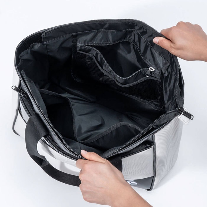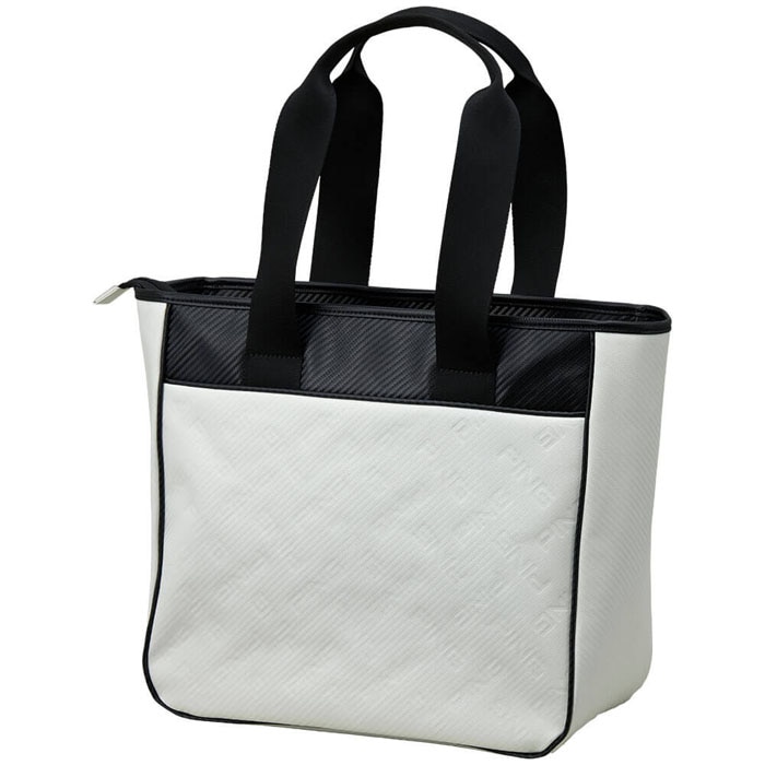 ・カーボン調のPU素材にエンボスロゴとエナメル部分使いでアクセントをつけたオーソドックスなトートバッグ・底を折りたたんで収納できる仕様・アウターには前面のZIP付きポケット、インナーには吊りポケットと差し込みポケット付き
