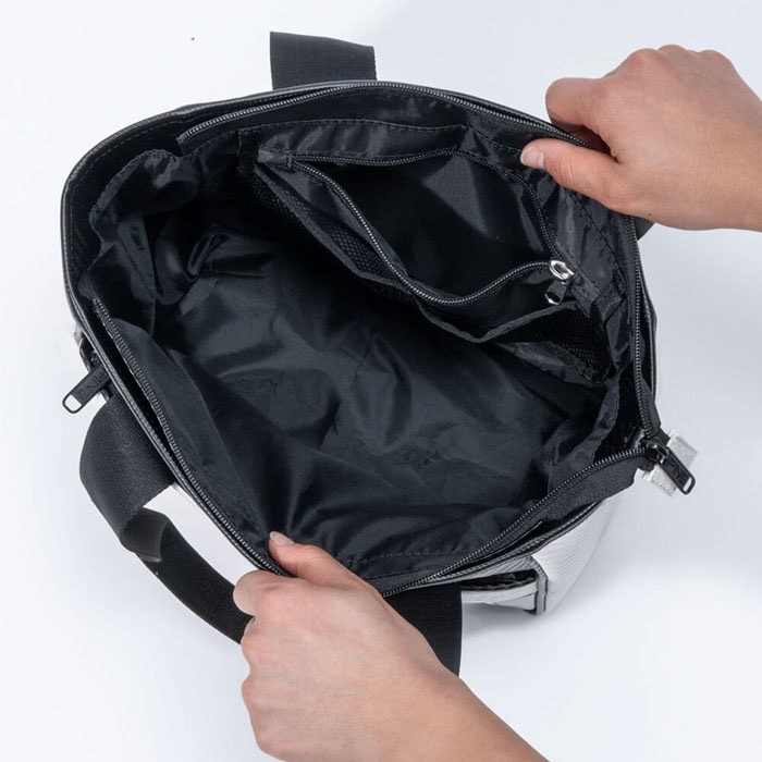 ・カーボン調のPU素材にエンボスロゴとエナメル部分使いでアクセントをつけたオーソドックスなラウンドトート・底を折りたたんで収納できる仕様・アウターには前面のZIP付きポケット、インナーには吊りポケット付き