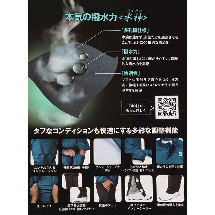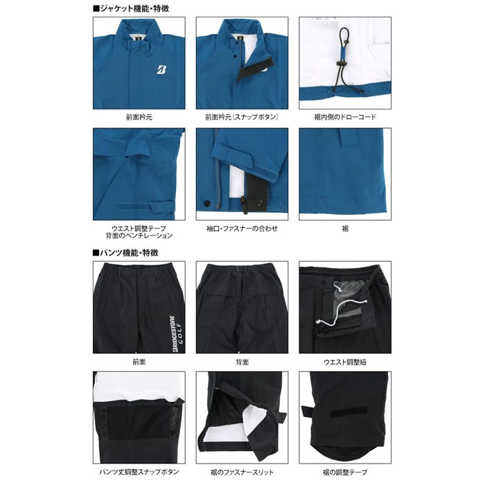 特長 ブリヂストンゴルフのレインウェア「水神」は進化し続ける撥水力が魅力。高い撥水力に加え、蒸れにくさも実現。ブルゾンは袖着脱可能、パンツは股下長さ調整やもたつき防止などプレーを妨げないよう細部にまでこだわった機能がついた多機能レインウェア。【Suizing】 驚・撥水レインウェア「水神」進化し続ける本気の撥水力納得の伸縮性で動きやすいレインウェア初期耐水圧 30,000mm、透湿度 22,000g/m2/24h■多孔膜仕様水滴は通さず、蒸気だけを通過させることで、ムレのにくく快適な着心地■撥水力水滴が潰れにくく転がりやすい、持続的な撥水力を実現。■快適性ソフトな肌触りで着心地よく、4方向に伸縮する高いストレッチ性で動きやすさを確保※収納袋はすべてBK(黒)です。※収納袋はブルゾンの衿ネーム部分に取り付けてあります。