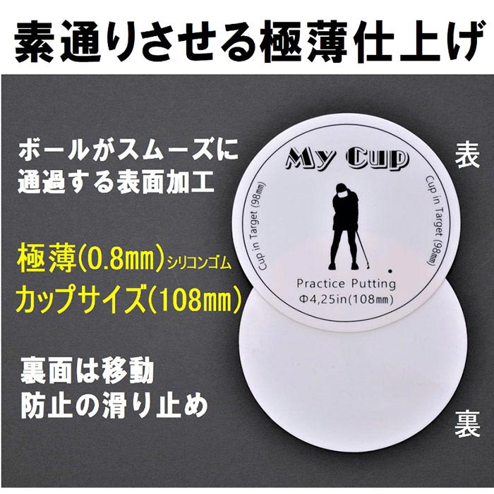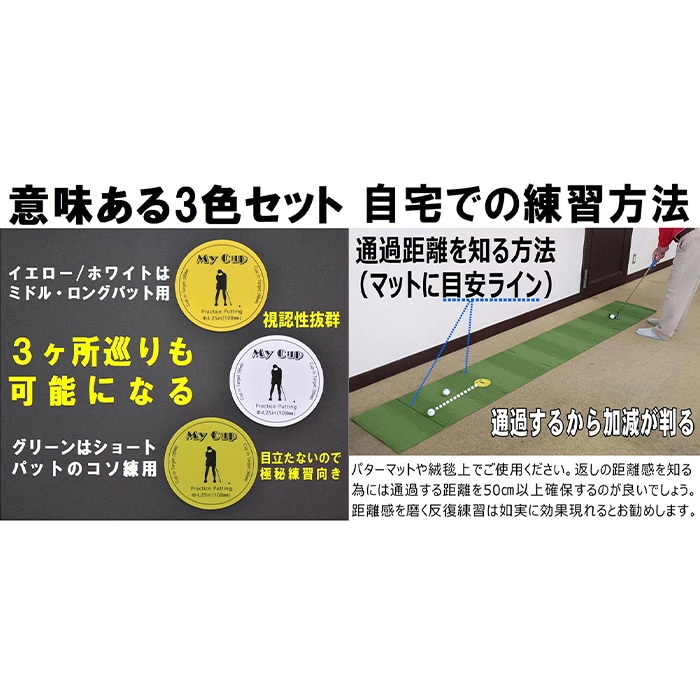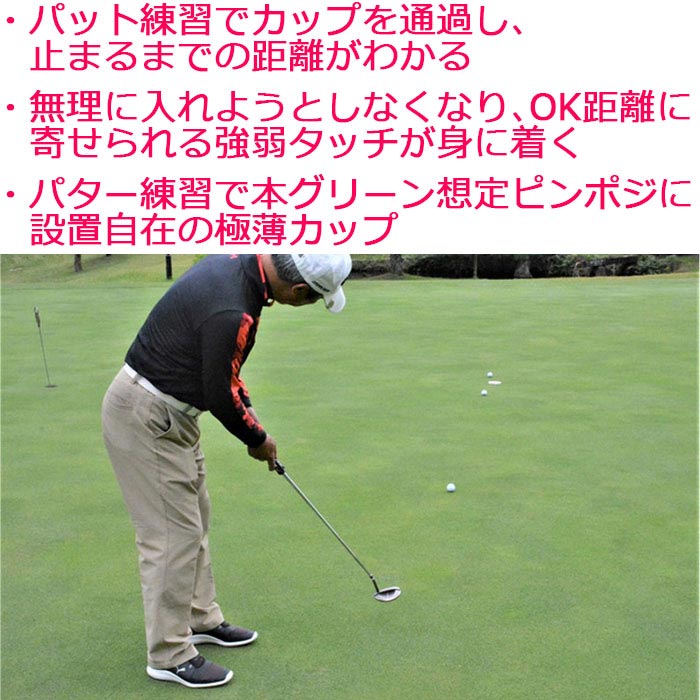 Q.自宅でも練習できますか? A.もちろんパターマットや絨毯上で使用できます。返しの距離感を養うためには通過する距離を50cm以上確保した方が良いでしょう。 マット上の同条件でも、距離感を磨く反復練習は効果ありとお勧めします。 ・パット練習でカップを通過し、止まる迄の距離が判る ・無理に入れようとしなくなり、OK距離に寄せられる強弱タッチが身に着く ・パター練習場で本グリーン想定ピンポジに設置自在の極薄カップ